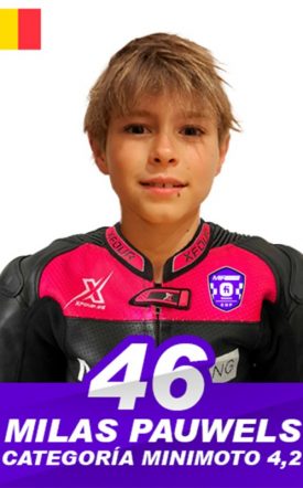 Milas Pauwels, piloto belga que debutaen la temporada 2025 en la categoría Minimoto. Con una gran pasión por el motociclismo y una fuerte determinación, Milas llega al campeonato con la motivación de demostrar su talento y enfrentarse a los desafíos de esta competitiva categoría desde su primer año.