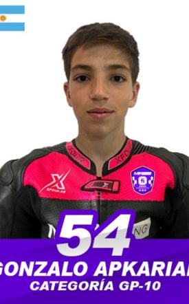 Gonzalo Apkarian, piloto argentino que debuta en la temporada 2025 de la categoría GP10. En 2023, Gonzalo participó en la categoría Minimoto, donde terminó en una destacada 7ª posición, demostrando su talento y capacidad para competir al más alto nivel. Su rendimiento en Minimoto le ha dado una sólida base para afrontar los retos de GP10 con confianza y determinación.